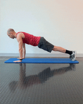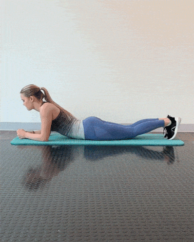 To begin, start on the floor on your stomach. With your feet together and your arms under your shoulders, slowly raise yourself off the ground. Try to eliminate any high hips or sagging lower back, and keep your head right in line with your spine. Engaging your abs, glutes, shoulders, and quads, breathe purposefully for time in this pose (i.e., begin with a 5-second hold, then a 10-second hold).
